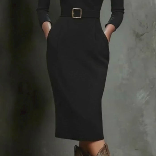 Un vestido de corte slim que se adapta a tu figura realzando cada curva con sutileza y poder. Su tejido premium estructurado define la cintura con un cinturón metálico ajustable que aporta sofisticación y estilo ejecutivo.