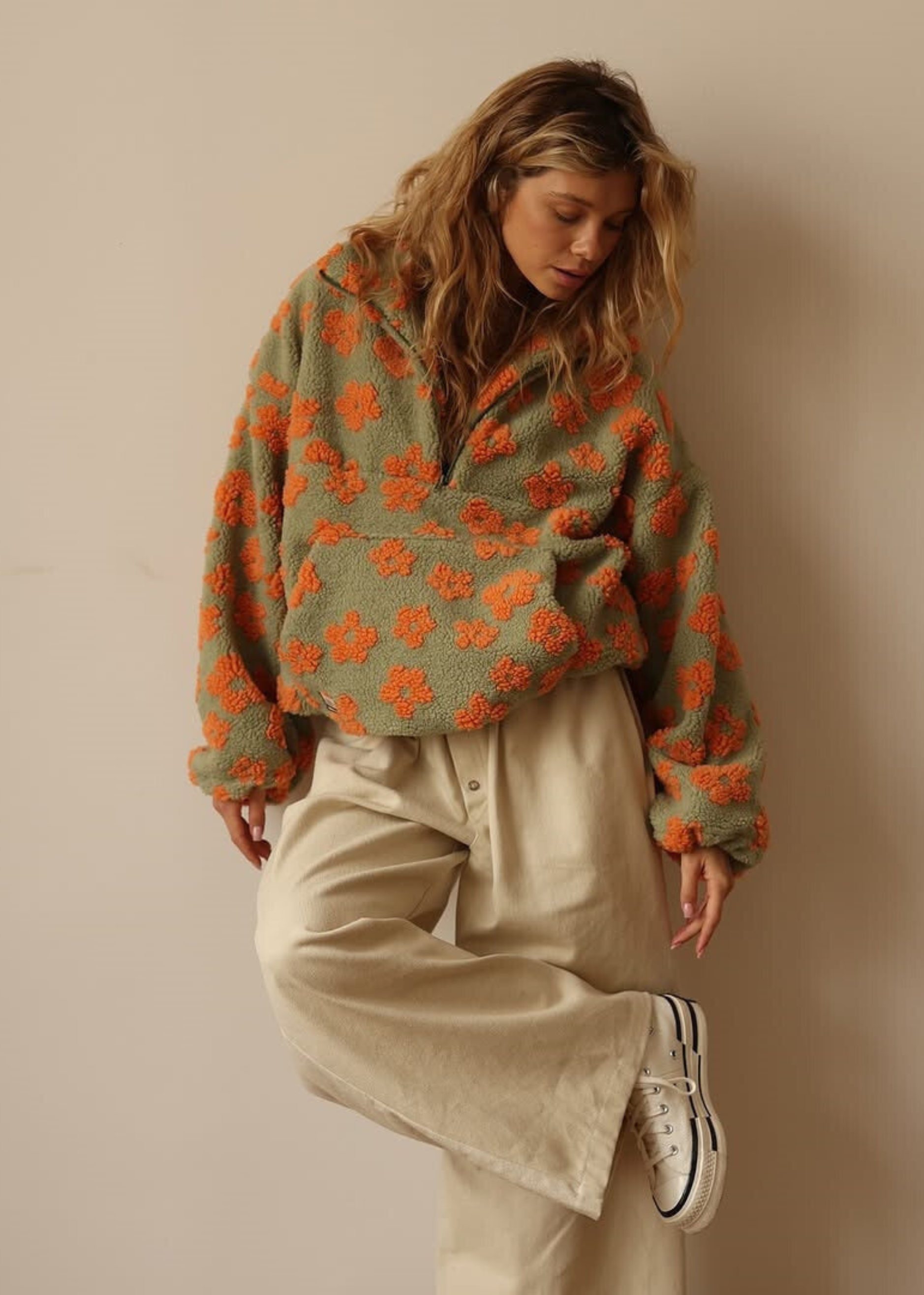Confeccionado en suave sherpa, este forro polar evoca la ternura de un abrazo, perfecto para los días frescos de otoño o las tardes acogedoras en casa.